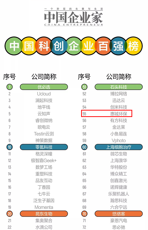 惠城環保榮登中國科創企業百強榜